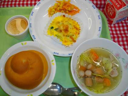 「ミルクパン、キッシュ・ロレーヌ、キャロットラペ、ポトフ、ブラマンジェ、牛乳」です。