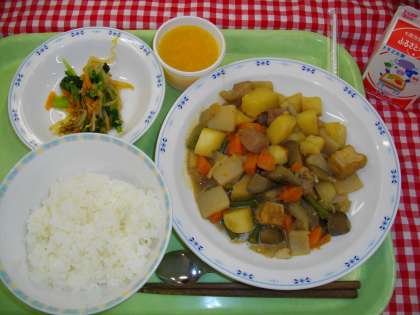 「ごはん、五目旨煮、磯香合え、みかんゼリー、牛乳」です。