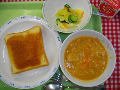 「シナモントースト、ポークビーンズ、フレンチサラダ、牛乳」です。