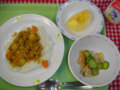「ひよこ豆のカレーライス、こんにゃくサラダ、りんご、牛乳」です。