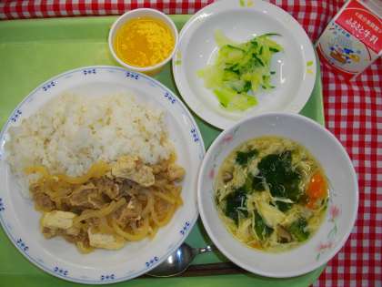 「豚丼、ひと塩野菜、かきたま汁、フルーツゼリー、牛乳」です。