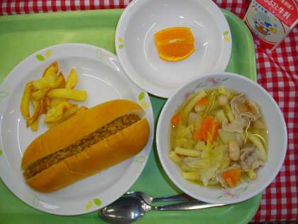 「ドライカレードッグ、フライドポテト、白いんげん豆の田舎風スープ、セミノール、牛乳」です。
