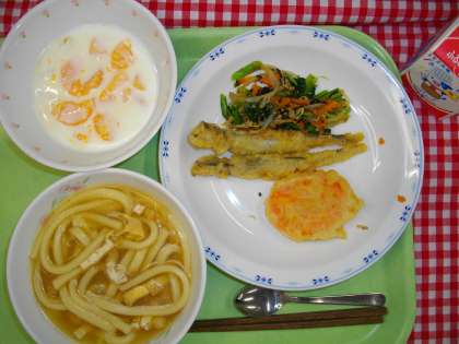「きつねうどん、ししゃも天ぷら、人参天ぷら、小松菜の乾物和え、フルーツヨーグルト、牛乳」です。