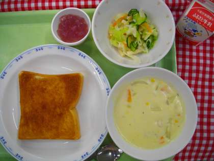 「シナモントースト、コーンチャウダー、マカロニサラダ、あじさいゼリー、牛乳」です。