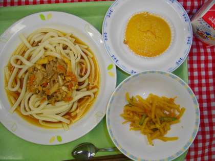 「五目冷やしうどん、じゃが芋の金平、キャロットケーキ、牛乳」です。