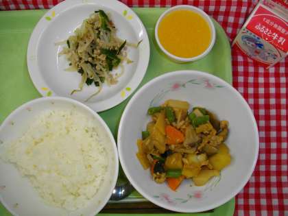 「ごはん、炒り鶏煮、にらもやし炒め、ピーチゼリー、牛乳」です。
