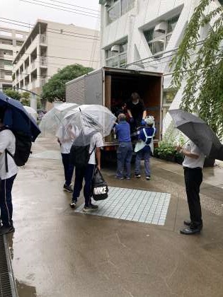 3年生は、登校時に修学旅行で使用する荷物の搬入をしています