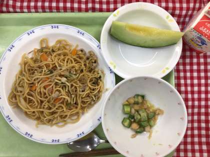 「塩焼きそば、ビーンズサラダ、メロン、牛乳」です。