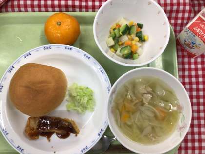 「セルフフィッシュサンド、マセドアンサラダ、レンズ豆のスープ、冷凍みかん、牛乳」です。
