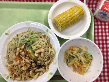 「冷やし中華、パリパリたっぷりサラダ、茹でとうもろこし、牛乳」です。