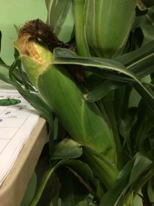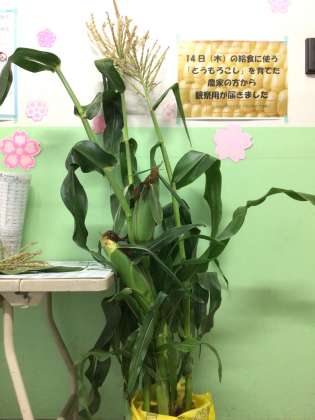 今日の「とうもろこし」は、八王子の水越農園さんが育てた東京そだちです。前日には、枝付きのサンプルをいただいたので、給食室の前に展示しました。優に1メートルは超え、畑のいっぱいに育っていたら、見事な景色だろうと想像できます。