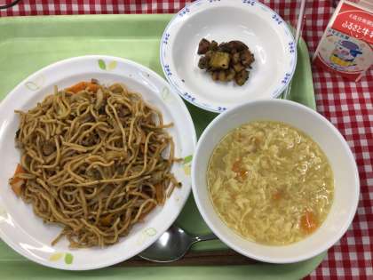 「ソース焼きそば、お豆かりんとう、中華風コーンスープ、牛乳」です。