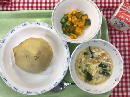 「ビスキュイパン、パンプキンサラダ、チーズのふわふわスープ、牛乳」です。