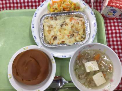 「黒砂糖パン、マカロニグラタン、コーンサラダ、豆腐スープ、牛乳」です。