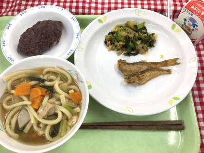 「けんちんうどん、はたはたの唐揚げ、野菜のかつお風味、おはぎ、牛乳」です。