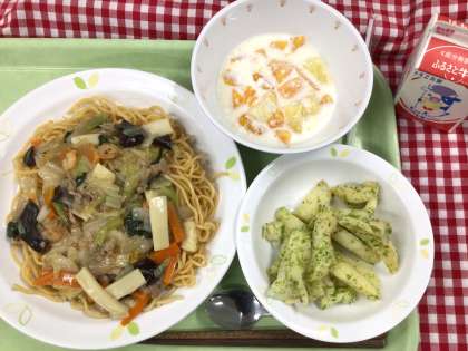 「五目あんかけそば、青のりフライドポテト、フルーツヨーグルト、牛乳」です、