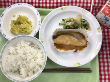 「麦ごはん、鮭の味噌マヨネーズ焼き、カレー粉ふき芋、和風サラダ、牛乳」