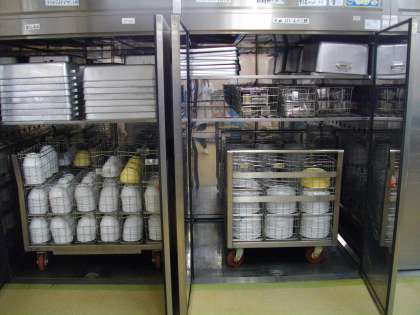 給食で使った食缶や食器は、手洗いの後、熱風消毒保管庫で乾燥し、次回使うまで保管します。今日は、保管庫内が設定温度まで達し、食器などの消毒がきちんと行われているかをサーモラベルで測定する検査を行いました。
