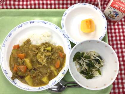 「秋野菜のカレーライス、和風サラダ、柿、牛乳」です。