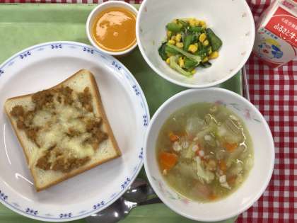 「豆そぼろのチーズトースト、スコッチブロス、小松菜サラダ、キャロットゼリー、牛乳」です。