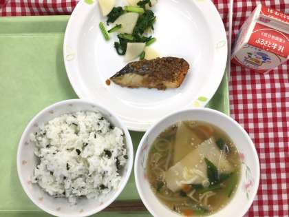 「わかめごはん、鯖の一味焼き、蕪のレモン醤油かけ、ワンタンスープ、牛乳」です。