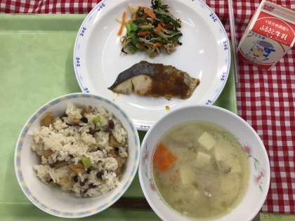 「豆まめごはん、白身魚のステーキソース、磯香和え、粕汁、牛乳」です。