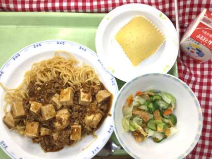 「麻婆豆腐焼きそば、パリパリサラダ、マーラーカオ、牛乳」です。