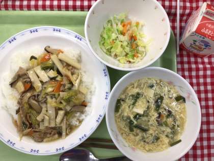 「中華丼、キャベツと大根のサラダ、にらたまスープ、牛乳」です。