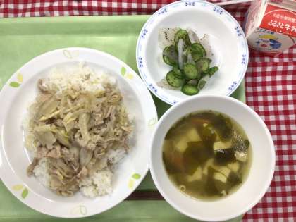 「ねぎ塩豚丼、大根のゆかり和え、わかめスープ、牛乳」です。