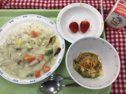 「シチューwithライス、味噌ドレサラダ、いちご、牛乳」です。