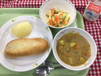 「ソフトフランスパン、カレーシチュー、マカロニサラダ、りんご、牛乳」です。