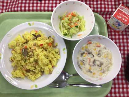 「パエリヤ、コールスローサラダ、コーンクリームスープ、牛乳」です。