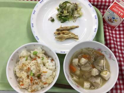 「子ぎつねごはん、わかさぎの天ぷら、野菜のゆかりかけ、豚汁、牛乳」です。