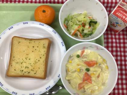 「ガーリックトースト、コーンシチュー、キャベツのハニーサラダ、みかん、牛乳」です。