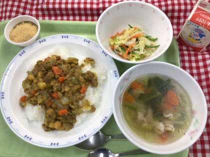 「ひよこ豆のカレーライス、らっきょうサラダ、野菜スープ、黒蜜寒天、牛乳」です。