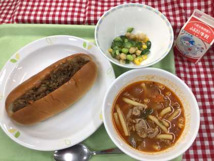 「プルコギサンド、コロコロ豆サラダ、ミネストローネ、牛乳」です。