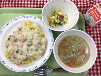 「ドリア、りんごと白菜のサラダ、スコッチブロス、牛乳」です。