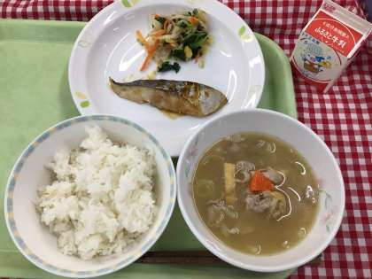 「麦ごはん、鰆の甘辛だれ、ほうれん草のおひたし、めった汁、牛乳」
