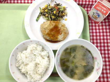 「麦ごはん、豆腐入りさくさくつくね、大根とひじきのサラダ、味噌汁、牛乳」です。