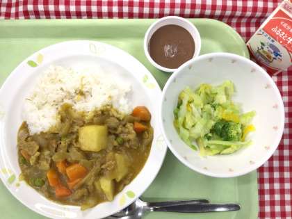 「カレーライス、グリーンサラダ、ココアプリン、牛乳」です。
