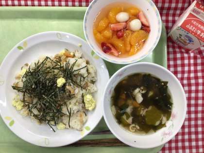 「ちらし寿司、紅白すまし汁、フルーツ白玉、牛乳」です。