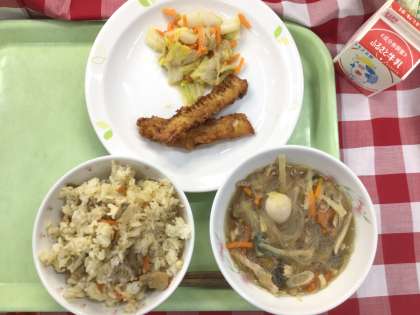 「鶏牛蒡ごはん、いかのかりんと揚げ、白キムチ、春雨スープ、牛乳」です。
