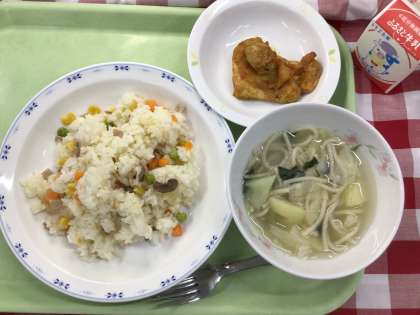「三色ピラフ、タンドリーチキン、野菜とスパゲティのスープ、牛乳」です。