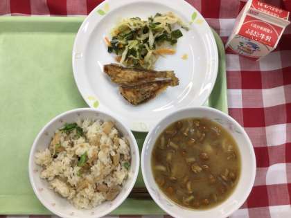 「筍ごはん、はたはたの唐揚げ、わかめサラダ、なめのこ味噌汁、牛乳」です。