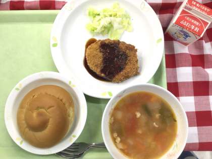 「明日葉パン、おからコロッケ、ボイルキャベツ、ミネストローネ、牛乳」です。