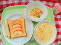 「きつねうどん、ししゃもの天ぷら、竹輪の磯辺揚げ、キャベツの乾物和え、サンフルーツ、牛乳」です。
