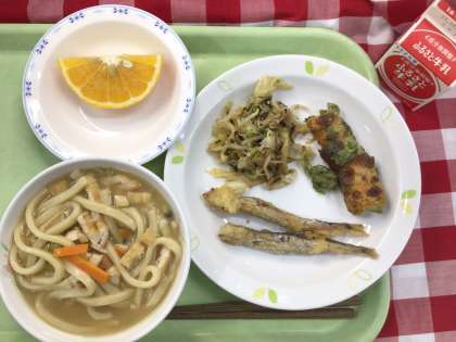 「きつねうどん、ししゃもの天ぷら、竹輪の磯辺揚げ、キャベツの乾物和え、サンフルーツ、牛乳」です。