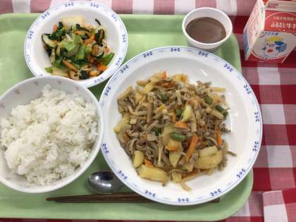 今日は、素揚げしたじゃが芋を加えたボリュームたっぷりの煮物(炒め煮)でした。今年の3年生は良く食べてくれて、牛乳のお残しも特定のメニューが大量に残ることもほとんどありません。身体作りの大切な時期ですので、バランス良く食べ、楽しく活動し、夜はゆっくりと休んでほしいと思います。2年生、1年生も3年生に続いていきましょう。