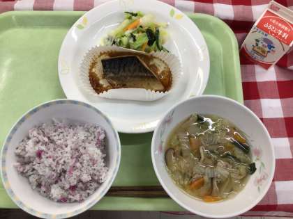 「ゆかりごはん、鯖の生姜風味焼き、春野菜とわかめのサラダ、白菜のスープ、牛乳」です。