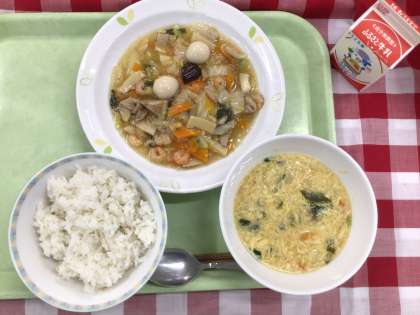 「麦ごはん、八宝菜、かきたま汁、牛乳」です。